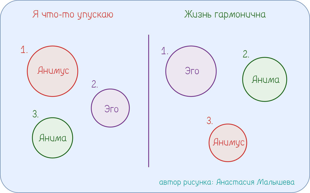 В хорошей ситуации в женщине властвует Эго в тандеме с Анимой (женской сущностью души), Эго хорошо справляется с контролем Анимуса. В этой ситуации женщина реализуется и как жена, и как профессионал (к примеру). Женщина гармонична, у неё нет ощущения, что она что-то упускает в жизни.