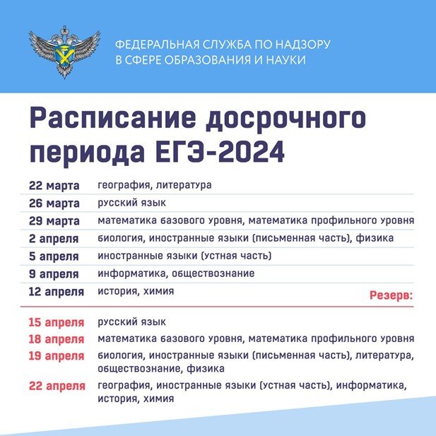 Резервные дни для сдачи всех предметов предусмотрены с 15 по 22 апреля.