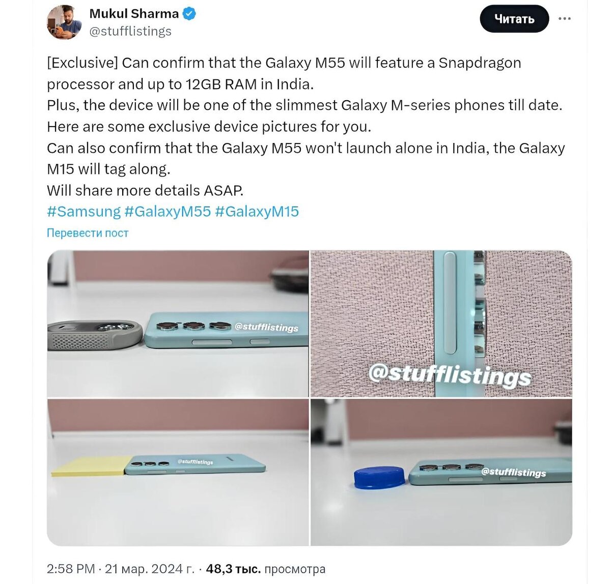 Samsung Galaxy M55 был замечен на платформе Geekbench еще в ноябре 2023 года. По последним данным, этот смартфон уже появился в базах данных органа BIS, сертификационной платформы FCC и консоли Google Play. Исходя из этих списков, можно предположить, что скоро устройство выйдет на рынок. А на днях в своем посте в социальной сети, инсайдер Мукул Шарма раскрыл ключевые детали о M55. По словам Шармы, Galaxy M55 будет оснащен чипсетом Snapdragon 7 Gen 1 и 12 ГБ оперативной памяти. Кроме того, Шарма утверждает, что этот смартфон станет самым тонким устройством в линейке M-серии от Samsung. Ожидается, что Galaxy M55 будет доступен в черном и синем цветах. Недавно информатор впервые увидел синюю версию Galaxy M55 и опубликовал несколько изображений, демонстрирующих его тонкий дизайн. По словам Шармы, Samsung также анонсирует Galaxy M15 вместе с M55. Устройство с чипом Dimensity 6100+ и аккумулятором емкостью 6000 мА*ч. Ранее опубликованные списки Play Console и Geekbench указывали на то, что