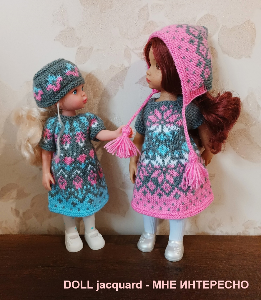 Сегодня довязала очень красивые и нежные комплекты для моих куколок - Маши и Сони. Мне нравятся сочетания цветов: серый фон и нежные розовый и голубой + немного белого. У Маши - верх реглан и шапочка в виде капора с кисточками на концах. Маша - это кукла из серии Любимая подружка, 37см, ее одежда подходит и для других кукол, совпадающих по размеру, подходит для: Руби Ред 37 см, Готц 36 см, Рохас 41 см, Сабрину АСИ. У Сони круглая кокетка в стиле лопапейса и шапочка. Соня - китайская куколка, подходит под размеры куколок в стиле Паолы Рейна МАСТЕР-КЛАССЫ БУДУТ УЖЕ ЗАВТРА А следующее фото - ответ на вопрос насколько одежда этих куколок подходит друг другу, смотрите сами как это выглядит: А вообще, девчонки у меня шутницы-баловницы, любят новые наряды и очень им радуются. Конечно я приглашаю вас в мои группы в ВК, вот и ссылки на них: - МНЕ ИНТЕРЕСНО и - МНЕ ВКУСНО - сборник подходящих рецептов - DOLL jacquard - МНЕ ИНТЕРЕСНО
