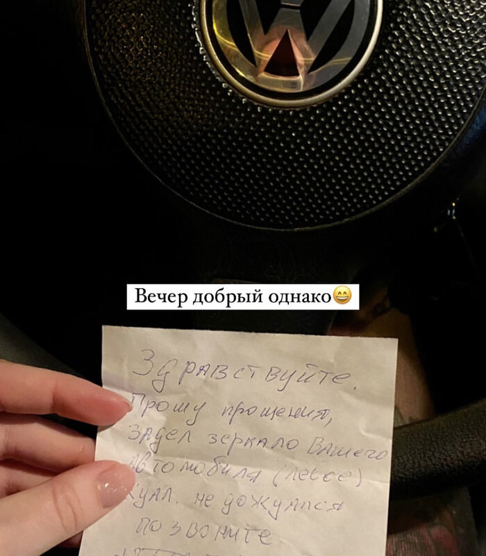 Год назад произошла ситуация. Приехала на работу, поставила машину, и до вечера естественно к машине не подходила. Вечером уже сажусь, замечаю под дворником бумажку, вчитываюсь и впадаю в маленький ступор. (Фото только такое, скриншот с истории в запрещеннограме). К слову, чтобы степень моего недоумения была понятна - машина стояла вдоль дороги, но рядом с ней с легкостью проехал бы камаз, если не белаз. Созваниваюсь с этим человеком, оказывается он спешил с сыном на тренировку, на плече болтались коньки, и вот по моему зеркалу прилетело этими самыми коньками. Вот это ж надо так - подумала я. Но здесь уже надо признать, что зеркало я планировала менять, тк там итак была трещина в пластиковой «обивке». На том и сошлись, что раз уж я итак планировала менять - то царапина, оставленная его коньками уже не такая и беда, и отпустила этого человека с миром и полным кошельком. Пост автора Iamyourscat. Комментарии к посту на сайте Пикабу.