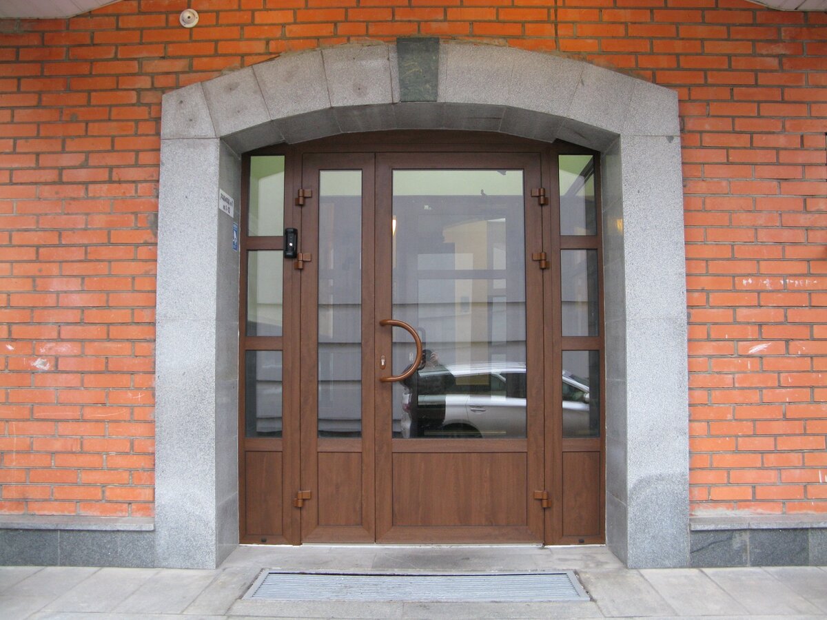 Дверь двухстворчатая с дополнительными глухими модулями по бокам. Изготовлена в холодном варианте, из алюминиевой профильной системы Alutech ALT C48 ламинированной в цвет орех, поскольку используется в системе тамбура и является первым контуром.
