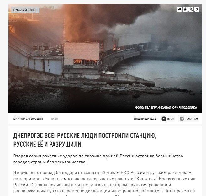 "Русские построили... русские и разрушили". Именно так начинается сегодняшняя статья на Царьграде. Правда, логики в таком резвом начале совсем не улавливаю. Строили ДнепроГЭС вообще-то наши деды и отцы, проектировали - талантливые инженеры. То государство не жалело средств на масштабный проект. Строили для нужд промышленности и растущих городов. Строили для будущего детей и внуков, чтобы им жилось лучше и комфортнее... И вот новые русские пришли и разрушили. Получается, дед и отец по кирпичику строили добротный дом, а сын пришел и все снес. Причем строить он не умеет, денег у него нет, талантами обделен. Он умеет лишь разрушать и громко кричать бранные слова в адрес соседей. Причем соседи нисколько не лучше... Уверен, кто-то обязательно начнет писать, что не было других вариантов, и вообще наши действовали очень разумно, предоставляя возможность людям покинуть территорию и т.д. Убрав ГЭС, можно было поставить ту сторону в крайне затруднительное положение. Лишить энергии - народ сам под