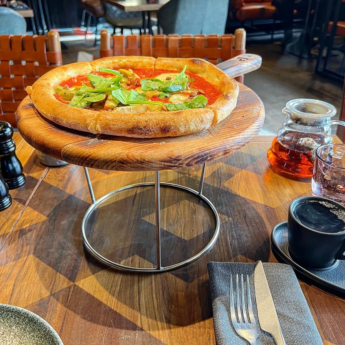 Пицца с маринованным кабачком, артишоками и тыквенными семенами из постного меню ресторана «Горячий цех» по 450 ₽. Постое меню в мясном ресторане — этот оксюморон уже привлекает внимание. Но тут и похлёбка, и вареники, и салаты. И даже пицца. Её и взял. Пиццу подают на деревянном подносе. Поднос устанавливают на специальную конструкцию, чтобы не занимал много места на столе. Сама пицца среднего размера. Прижарена. Если говорить про основу, а основа это залог вкуса пиццы, основа хороша. По центру тесто очень тонкое, а борты наоборот — пышные. Тесто вкусное, бортики вкусны сами по себе и съедаются с большим удовольствием. Начинка - это томатная паста с сухими травами, сверху разложены тонкие слайсы кабачков, достаточно много артишоков и присыпано это поджаренными тыквенными семечками и украшено листьями шпината. Начинка сочная, с тестом сочетается прекрасно. Обратите внимание, в пицце нет сыра, но это никак не ухудшает восприятие. Постные блюда традиционно не оцениваю. Но та