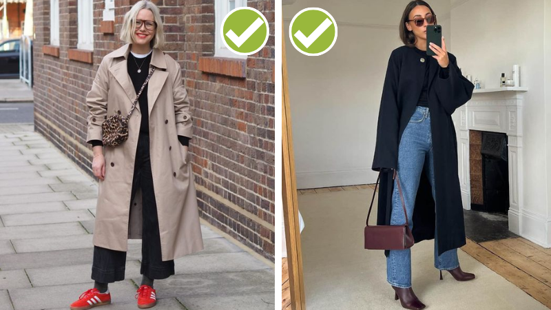 В случае с юбками и платьями стоит учитывать, что нижний слой не должен выглядывать из-под полы тренчкота
