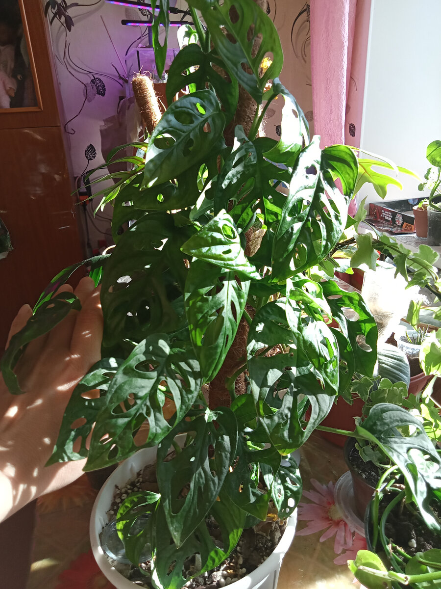 Монстера Адансона для цветоводов является довольно привлекательным растением. У нее оригинальная внешность, красивые резные листья, она не предъявляет особых требований в уходе. Есть и вариегатные формы, листья которых вдобавок имеют разнообразную расцветку. Можно встретить ее и под названием "монстера пертуза" - так она была записана в старых каталогах. Пертуза - от латинского Pertusum, то есть "дыра". Относительно нетребовательности в уходе могу сказать, что не надо забывать поливать монстеру. Яркое солнце она приветствует, но прямые лучи могут обжечь листья. Вот этот монстр на картинке был когда-то несчастной лысой веревкой с хвостиком из пяти листочков на конце. Хозяйка постоянно работала и попросту забывала ее поливать. Монстера от такого пренебрежения сбросила все листья и принялась выбрасывать длинные побеги - искала воду. Я просто наладила ей полив. Вот такая она сейчас - толстая и красивая 😁 Немного о виде. Впервые это растение было обнаружено в Америке. Сперва монстера поп