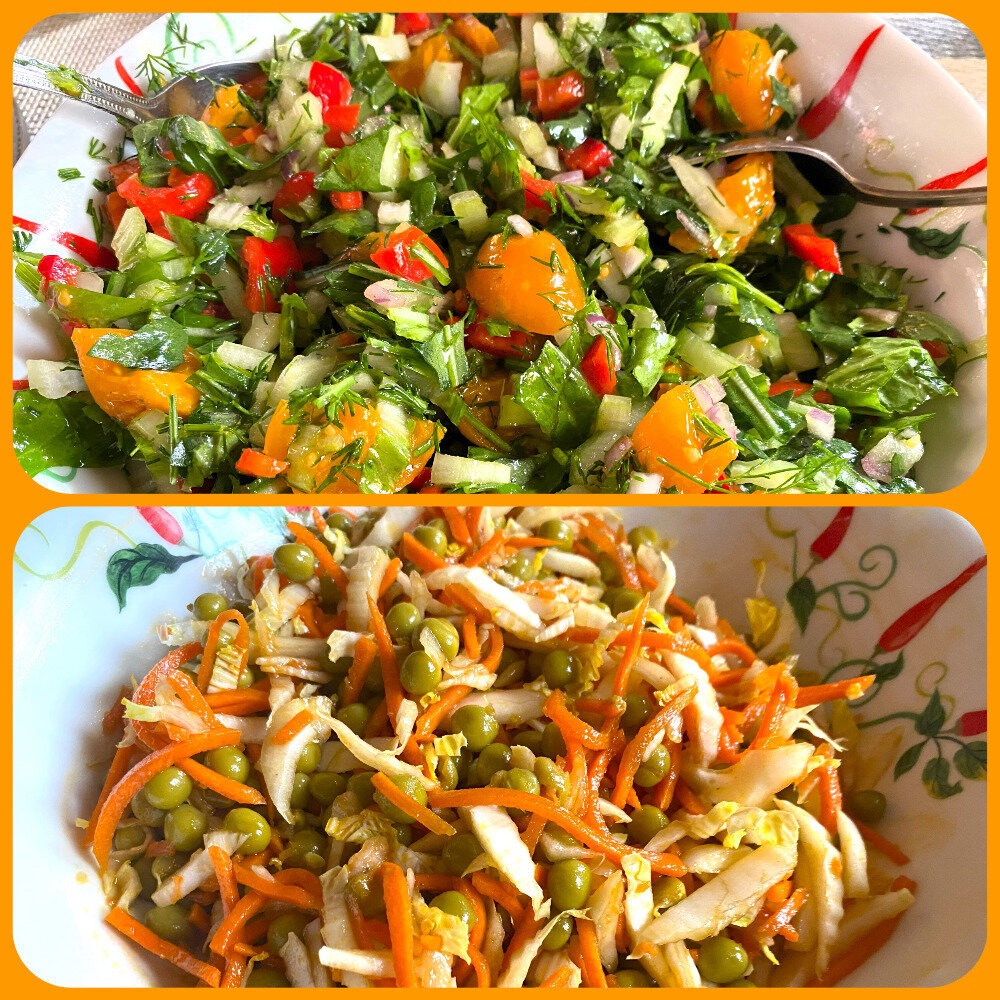 Салаты получаются хрусткими, сочными. Очень простые в приготовлении, пока готовится основное блюдо, успеваю настрогать целый тазик. ✅ Пекинская капуста с перцем и помидорами Черешки китайской капусты нарезаю некрупными кусочками. Помидоры специально купила оранжевые черри, чтобы салат был поярче.