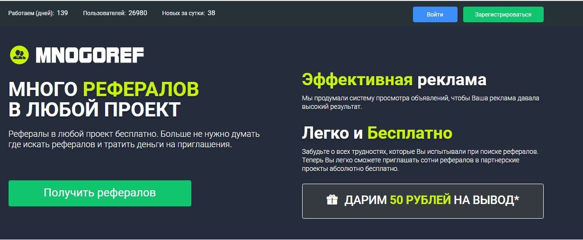 Рефералы в любой проект бесплатно. Больше не нужно думать где искать рефералов и тратить деньги на приглашения. Mnogoref-полностью бесплатный способ привлечения рефералов в ваши проекты. Это система, которая позволит вам абсолютно бесплатно привлекать рефералов в ваши проекты. Принцип набора рефералов основан на взаимопиаре. Вы рекламируете свой проект и его смотрят другие участники. В то же время вы просматриваете проекты других участников и зарабатываете внутреннюю валюту сайта-поинты. За нее вы размещаете и поднимаете свое объявление на сайте Mnogoref. Многие пользователи в интернете постоянно ищут стоящие проекты по заработку. И если сайт который вы рекламируете вызовет у них интерес, вы получите заинтересованного реферала. РЕГИСТРАЦИЯ Для регистрации на сайте Mnogoref заполняем простую регистрационную форму. Вводим свой логин, электронную почту, и придумываем сложный пароль. Далее кликаем по кнопке «зарегистрироваться» ЗАРАБОТОК ПОИНТОВ На проекте Mnogoref переходим в навигацион