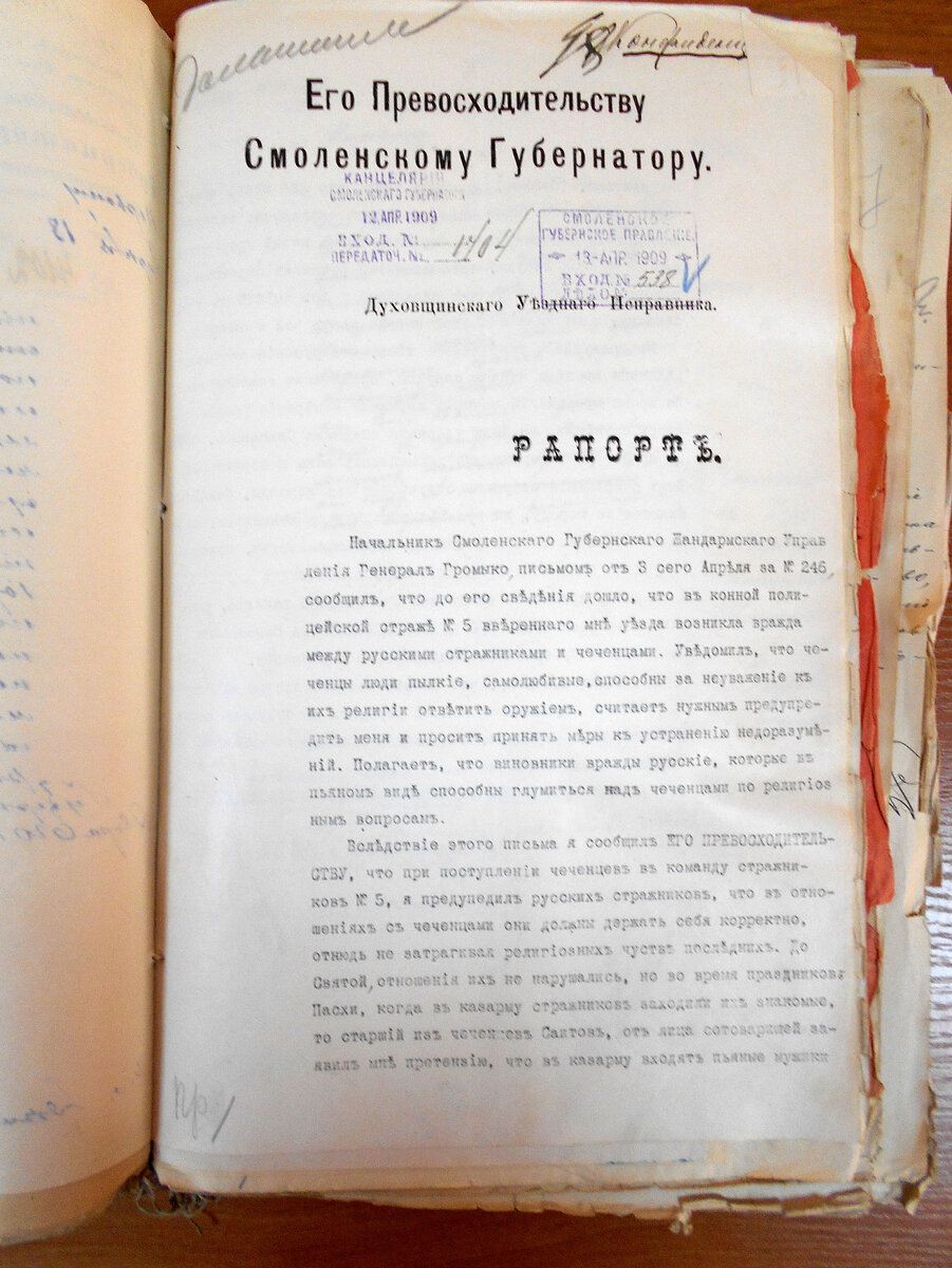 Начальник Смоленского Губернского Жандармского Управления Генерал Громыко письмом от 3 сего Апреля за №246 сообщил, что до его сведения дошло, что в конной полицейской страже №5 вверенного мне уезда возникла вражда между русскими стражниками и чеченцами. Уведомил, что ЧЕЧЕНЦЫ ЛЮДИ ПЫЛКИЕ, САМОЛЮБИВЫЕ, способны за неуважение к их религии ответить оружием, считает нужным предупредить меня и просить принять меры к устранению недоразумений. Полагает, что виновники вражды русские, которые в пьяном виде способны глумиться над чеченцами по религиозным вопросам. Вследствие этого письма я сообщил ЕГО ПРЕВОСХОДИТЕЛЬСТВУ, что при поступлении чеченцев в команду стражников №5, я предупредил русских стражников, что в отношениях с чеченцами они должны держать себя корректно, отнюдь не затрагивая религиозных чувств последних. До Святой, отношения их не нарушались, но во время праздников Пасхи, когда в казарму стражников заходили их знакомые, то старший из чеченцев САИТОВ, от лица сотоварищей заявил
