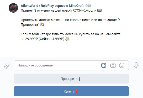 Немного информации: RCON-Консоль Бот — это бот, который позволяет получить доступ к удалённому управлению серверу и доступу к консоли через сообщения сообщества. Мною была произведена разработка самого бота, его интеграция в админ панель моей прошлой работы, частичная модернизация библиотеки из интернета. Используемые языки/инструменты: PHP, xPaw/PHP-Source-Query, VK API, SimpleVk-Master V2. Обзор бота: Меню бота, в которое юзер попадает при заходе в лс сообщества или введя команду или нажав на кнопку. При нажатии на кнопку «Купить» или введя соответствующую команду, бот будет предлагать купить доступ. Нажав на кнопку проверить, выскакивает сообщение, в котором описана информация о сервере бота и уровне доступа юзера. Если у Вас есть доступ к бота, то Вам доступна команда «/Помощь»: Так же, со 2 LVL уровня доступа будет доступен просмотр списка разрешённых команд: Отправка команды происходит путём ввода «/Отправить + [КОМАНДА]», но в боте присутствует режим «Консоли», он доступен с 1