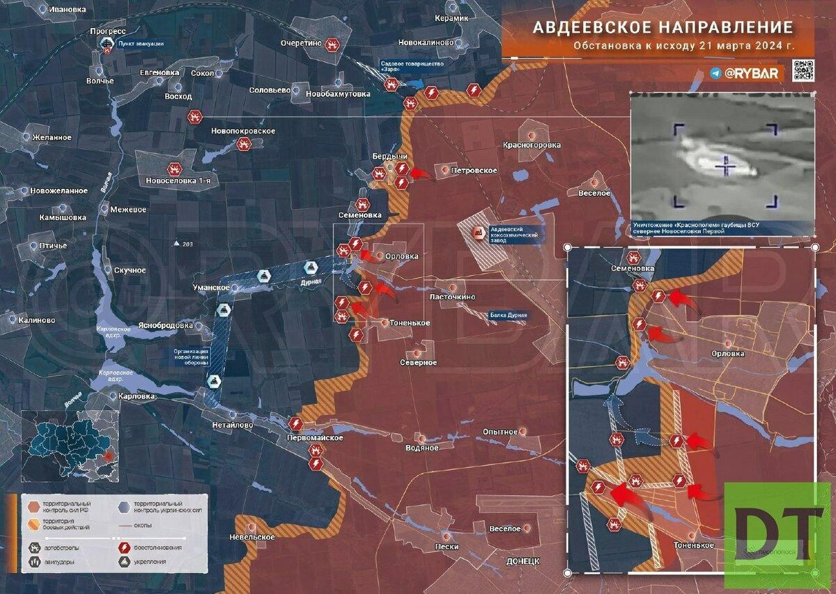 Россия наносит удары по энергетике Украины. Они стали самыми разрушительными с начала СВО. По состоянию на субботу 23.03.2024, стало известно о поражении целого ряда критически важных объектов нацисткой части Украины: уничтожено оборудование ДнепроГЭС, поражены объекты снабжения электричеством и связью в Харькове и Кривом Роге, под удар попали Бурштынская и Ладыжинская ТЭС (запитывали местную промышленность, в том числе и военную). По словам военного историка Юрия Кнутова, удары российской армии по энергетике Украины наносятся не хаотично, а точно и выверено — это нужно для того, чтобы лишить энергоснабжения военную инфраструктуру Украины, а также лишить оборонные предприятия возможности работать на полную мощность. В это же время, по информации Минобороны РФ, российские самолеты Су-34 нанесли удар по опорному пункту противника и скоплениям живой силы и техники на Южно-Донецком направлении, а на Артемовском направлении ивановские десантники уничтожили украинский пункт управления беспил