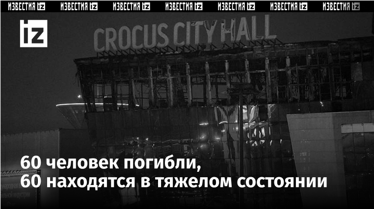 Более 60 человек погибли в результате теракта, который произошел 22 марта в подмосковном «Крокус Сити Холле». Об этом сообщила пресс-служба СК РФ в своем Telegram-канале. «Производится осмотр тел погибших. Предварительно установлено, что погибших в результате теракта более 60 человек. К сожалению, количество жертв может увеличиться», — говорится в сообщении ведомства. В СК РФ добавили, что с места преступления изымаются вещественные доказательства, в том числе оружие и боеприпасы, уже начали проводиться необходимые экспертизы, в числе которых генетические, баллистические, дактилоскопические. Стрельба в «Крокус Сити Холле» произошла вечером в пятницу, 22 марта. В концертном зале должно было пройти выступление группы «Пикник». Кроме того, злоумышленники подожгли зал, огнем было охвачено почти 13 тыс. кв. м. К настоящему моменту возгорание локализовано. По данным Генпрокуратуры РФ, в здание ворвались неизвестные в камуфляже и устроили стрельбу. Было возбуждено уголовное дело по ст. 205 УК