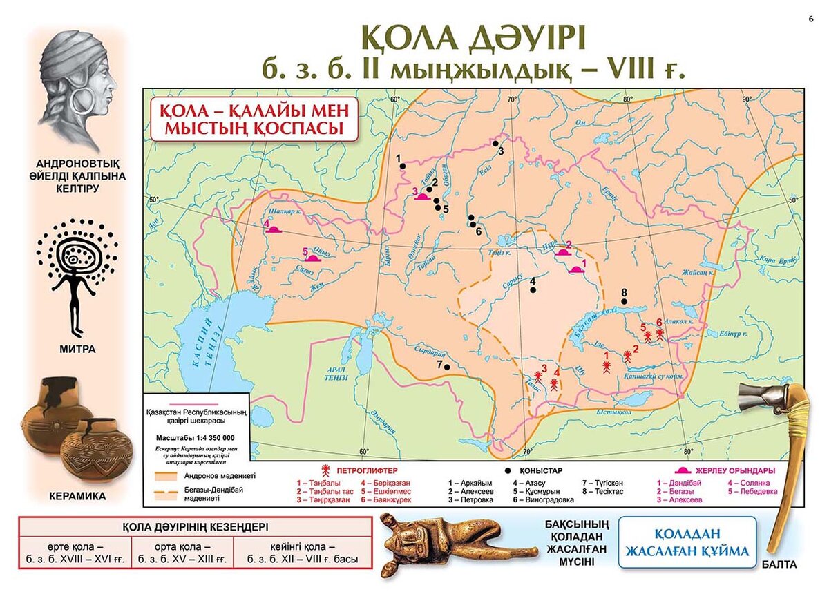 Б.з.б. 3000 жылы Қазақстан аумағындағы адамдар мыс металлын игере бастады. Адамдар энеолит (мысты тас) дәуіріне көшті. Б.з.б. 1600-1500 жылдары Қазақстан аумағындағы адамдар мыс пен қалайы металлдарды біріктіріп қоланы алды. Б.з.б. 700 жылдары Қазақстан аумағында адамдар темірді игерді. Қазақстан жерінде металлды игеру адамдардың Сурет ғаламтордан алынды