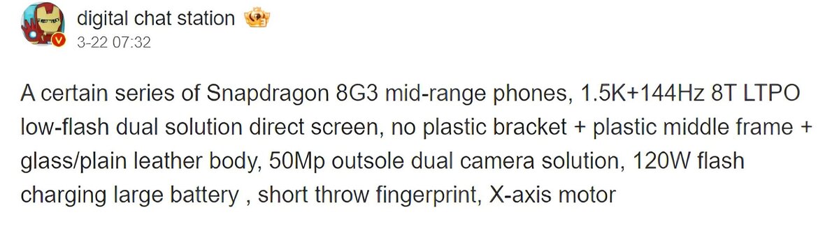 Iqoo объявила о намерении выпустить новый смартфон серии z на внутреннем рынке Китая в апреле. Это новое устройство, входящее в серию z9, будет оснащено недавно выпущенным чипсетом Snapdragon 8s Gen 3, являющимся более доступной версией флагманского Snapdragon 8 Gen 3. Кроме того, по информации от источника DCS, бренд также планирует представить устройство среднего класса с процессором Snapdragon 8 Gen 3, которое, вероятно, будет относиться к серии Iqoo neо. Согласно инсайдеру DCS, предположительно этот новый смартфон будет называться Iqoo neo 10 или neo 10 Pro, и оснащен будет чипсетом Snapdragon 8 Gen 3. Несмотря на то, что уже существует смартфон среднего класса Redmi k70 Pro с таким процессором, новое устройство все равно сможет представлять жесткую конкуренцию для k70 Pro. Утверждается, что новое устройство будет иметь дисплей с частотой 144 Гц и разрешением 1,5k, который будет использовать панель 8T LTPS с технологией подавления мерцания. Отмечается, что в телефоне также будет ус