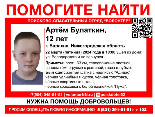 В Нижегородской области ищут ребенка - 12-летнего Артема Булаткина. Всех, кто располагает какой-то информацией о местонахождении Артема, просят откликнуться по указанным телефонам. Артём Булаткин, 12 лет