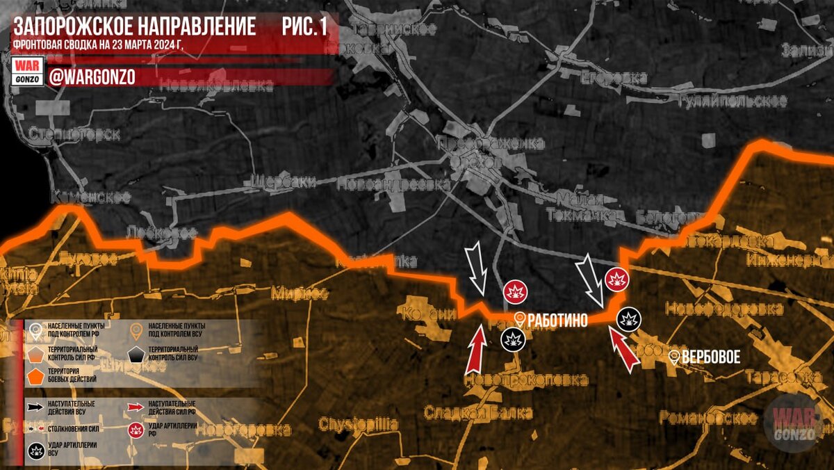 Запорожский фронт. ЛБС без существенных изменений. Продолжаются бои с применением артиллерии в Работино и северо-западнее Вербового. (Рис. 1) На Донецком фронте тоже без существенных изменений. Идут активные бои на линии Тоненькое-Орловка-Бердычи. Тут ВС РФ стремятся развить наступление к Семёновке и выбить ВСУ из Бердычей. Встречные бои в районе Победы и Первомайского (Рис. 2) Бахмутское направление. Российские войска стремятся пробиться к Часов Яру севернее Ивановского (Красного). По самому городу активно работает авиация и артиллерия ВС РФ (Рис. 3) На Харьковском направлении ВСУ вновь наносили удары по Белгороду и населённым пунктам области. Смотрите ежедневные сводки от аналитического отдела @wargonzoya *наш проект существует на средства подписчиков, карта для помощи 4276 3801 4149 1378