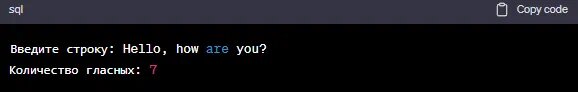 Пример работы программы: Введите строку: Hello, how are you? Количество гласных: 7 Подсказка: Вы можете использовать цикл for для прохода по каждому символу строки и проверять, является ли символ гласной буквой. Для этого можно создать список гласных букв и использовать условный оператор if.