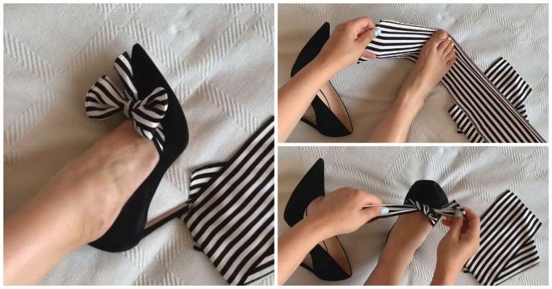 Такие гламурные портянки улучшат внешний вид любых строгих, классических туфель и даже балеток! Кроме того, дополнительный кусочек ткани будет защищать пальцы от натирания во время ходьбы. Возьмите широкую полоску красивой, тонкой ткани. Ширина её должна составлять от кончиков пальцев до середины ступни, длина — достаточная, чтобы обернуть ногу и завязать бант. Оберните и перекрестите ткань так, чтобы одна часть была короче другой. Наденьте туфлю, поддерживая ткань. Завяжите простой узел. И бантик, сделанный из длинного конца ткани (бант с 1 петлёй). Вот такие элегантные портянки прекрасно дополнят и преобразят обычные туфли! 👍 Рекомендуем