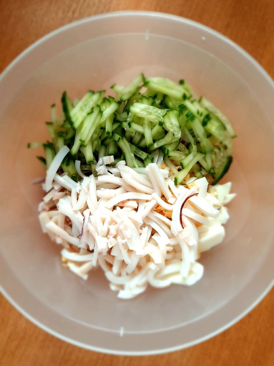4. В миске все посолить и поперчить по вкусу. Добавить майонез и перемешать.