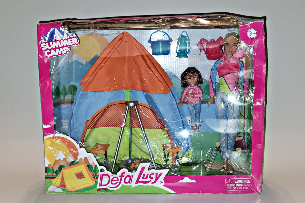 В прошлом году мне было как-то не до покупки палатки, а зимой даже в кукло-мире она казалась мне не актуальной. А сейчас — самое время начинать готовить к летнему сезону... Набор приехал в «убитой» коробке. Но главное всё осталось в целости. С малышами от Defa Lucy я знакома (несколько таких живут в моей «Так себе Коллекции»), а вот кукла-мама — первая. Неоднозначное мнение о ней сложилось — качество вроде бы и не плохое, но ноги очень прям по ощущениям напоминают «барбеек» из 90-х (*^-^*). Жить у меня не сами куклы не останутся.