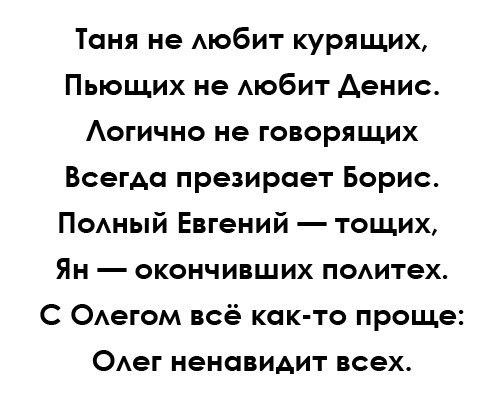Например, я могу категорично заявить, что не люблю рэп и, тем самым, разом лишить себя благосклонности всех девушек, отдающих предпочтение этому, с позволения сказать, музыкальному направлению. Но мне нравятся отдельные работы Касты, Басты и почти весь репертуар Кровосток. А, ради общества девушки с определенными внешними данными, я, в принципе, готов терпеть любую пародию на музыку, ходить на службы любого милого ей бога и митинговать за любого милого ей клоуна.