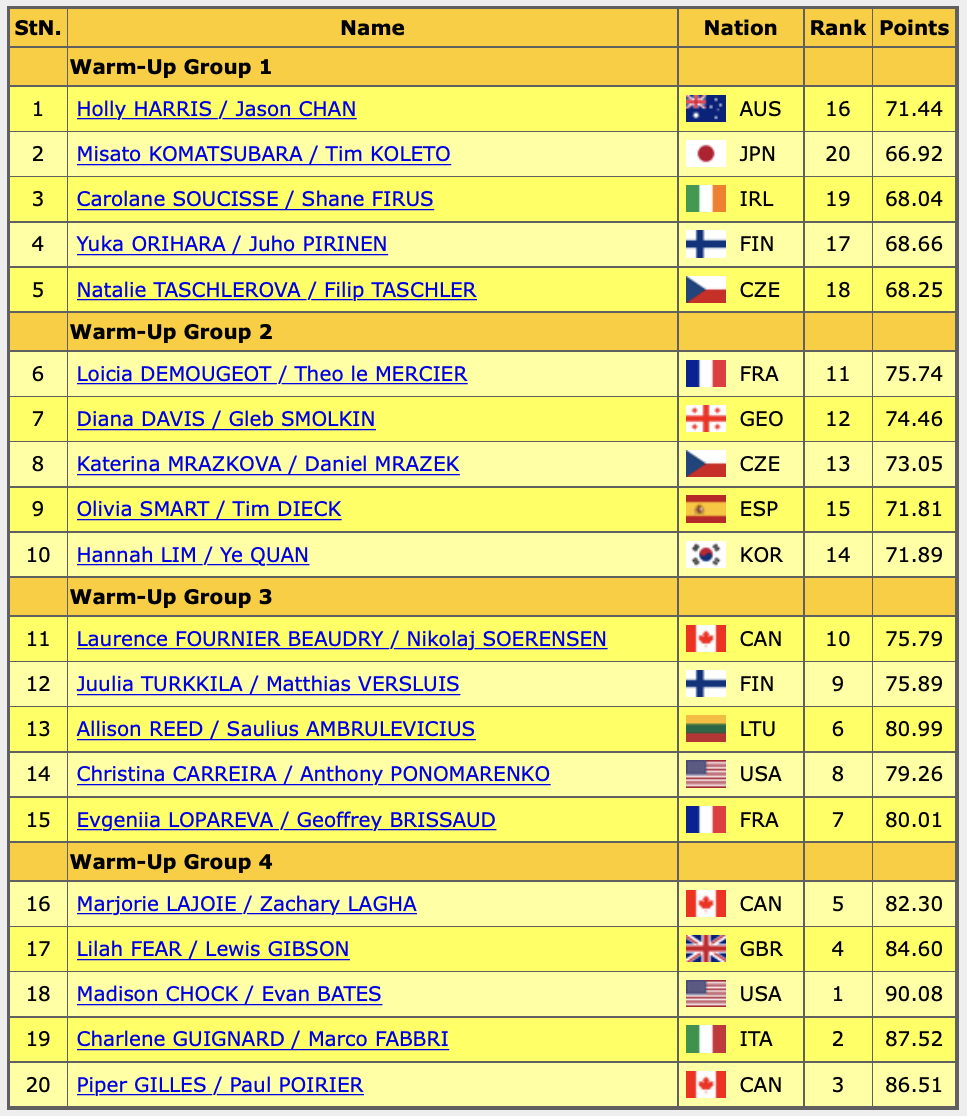 Порядок выхода на лёд и результаты первого дня тех, кто отобрался в произвольную:
