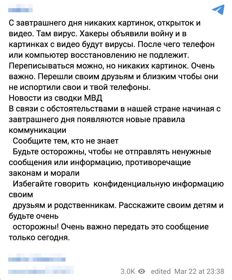 На фоне теракта в «Крокус Сити Холле» начал распространяться старый фейк о вирусах, которые якобы передаются при пересылке фото, видео и открыток в мессенджерах по телефону. Из-за этого якобы в «нашей стране вводятся новые правила коммуникации». «Новости из сводки МВД. В связи с обстоятельствами в нашей стране, начиная с завтрашнего дня, появляются новые правила коммуникации», — говорится в сообщении. На самом деле опасны для смартфонов могут быть только ссылки с вредоносным контентом. Важно не переходить по ним и не устанавливать приложений из сомнительных источников. Фото и видео и открытки — безвредны. Этот фейк неоднократно опровергала «Лапша Медиа». На недостоверность информации указывает и загадочная фраза «с завтрашнего дня» без привязки к дате. А также отсылка к авторитетному источнику, сводке МВД, без самой ссылки на источник. Пост опубликован вечером 22 марта после теракта в Подмосковье. На фоне трагических событий в информационном поле могут распространяться как преднамеренн