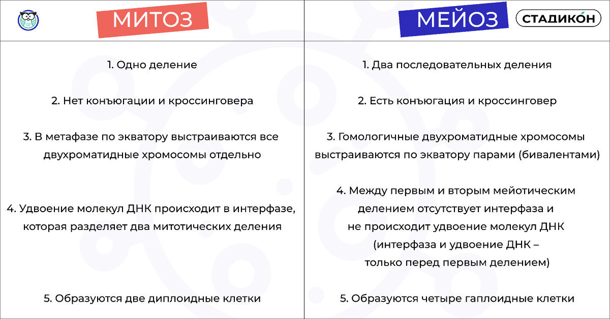 Мейоз – процесс деления клеток, в результате которого происходит уменьшение (редукция) числа хромосом. Мейоз состоит из двух последовательных делений – редукционного (профаза I, метафаза I, анафаза I, телофаза I), приводящего к уменьшению хромосомного набора в два раза, и равного эквационного равного (профаза II, метафаза II, анафаза II, телофаза II). В результате мейоза из диплоидной материнской клетки образуется четыре гаплоидных дочерних клетки.