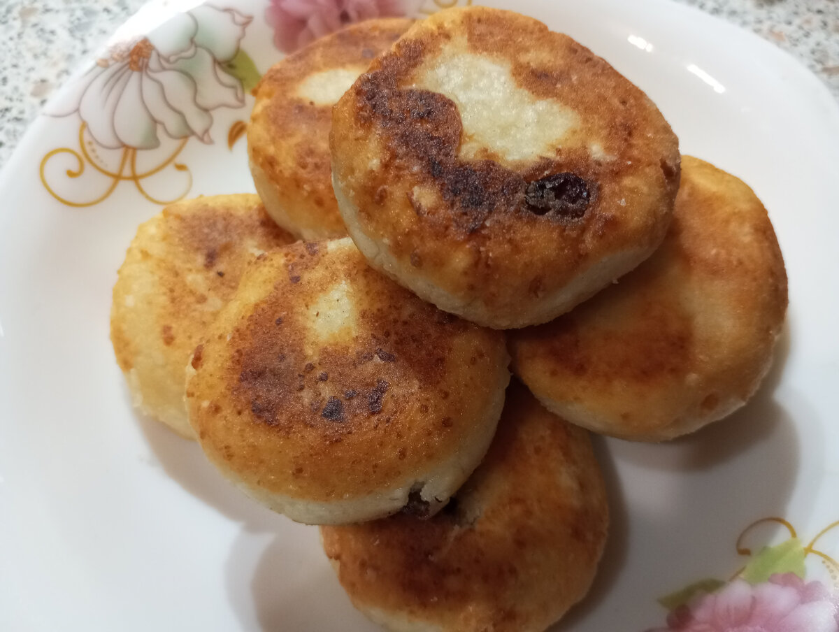 Ингредиенты творог 9% 500 г манная крупа 100 г сахар 4 ст. л соль 2 щепотки ванилин 1 пакетик изюм по вкусу мука по вкусу Творог соединить с манной крупой, сахаром, солью, ванилином. Перемешать, оставить на 20-30 минут. По желанию добавить изюм. Сформировать шарики размером с куриное яйцо, обвалять в муке. Приплюснуть в форму шайбы. Выложить на сковороду с разогретым растительным маслом. Жарить с двух сторон по 3-4 минуты, на среднем огне. Приятного аппетита!!!
