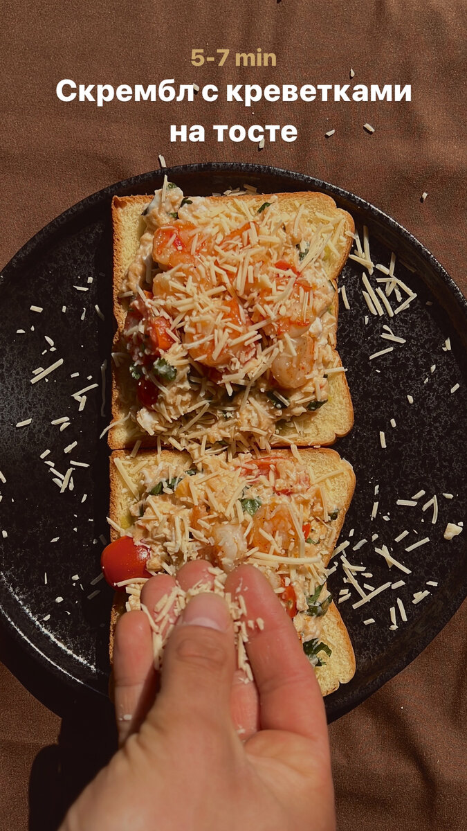 Ингредиенты : -авокадо -яйца -томаты черри -кинза -креветки -пармезан -соль/перец/паприка Готовим 😋 1.Спелый авокадо тщательно разминаем вилкой и выкладываем на тост 2.На сковороде обжариваем яйца в виде скрэмбла с томатами и кинзой 3.Креветки обжариваем со специями и выкладываем на тост Приятного аппетита 😋 Еще больше рецептов в телеграмм канале По вкусу - Вкусно