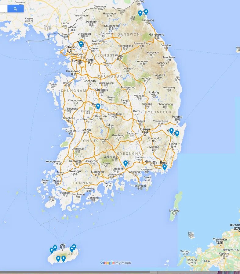 По материковой части проехали 1340км + 370 км по острову, итого общий пробег составил 1700км. Гугл с Кореей не дружит, маршруты не прокладывает, поэтому просто обозначил посещенные места точками. Итак, Южная Корея. С первого же шага по Сеулу становится понятно, что это совершенно не Китай. Наверное, похоже на Японию, но там я пока не был.
