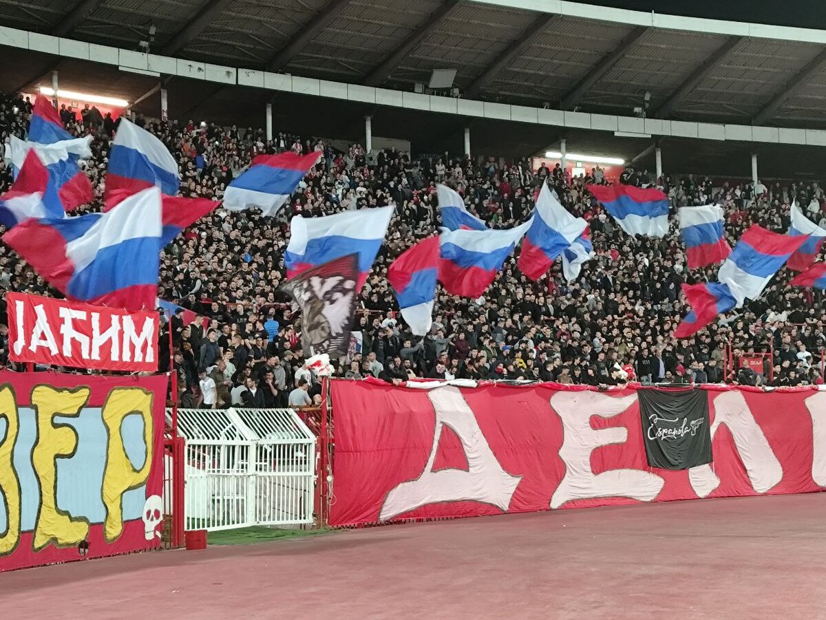 Вывесили баннеры и флаги: фанаты «Црвены Звезды» устроили перфоманс в поддержку России во время товарищеского матча с «Зенитом»