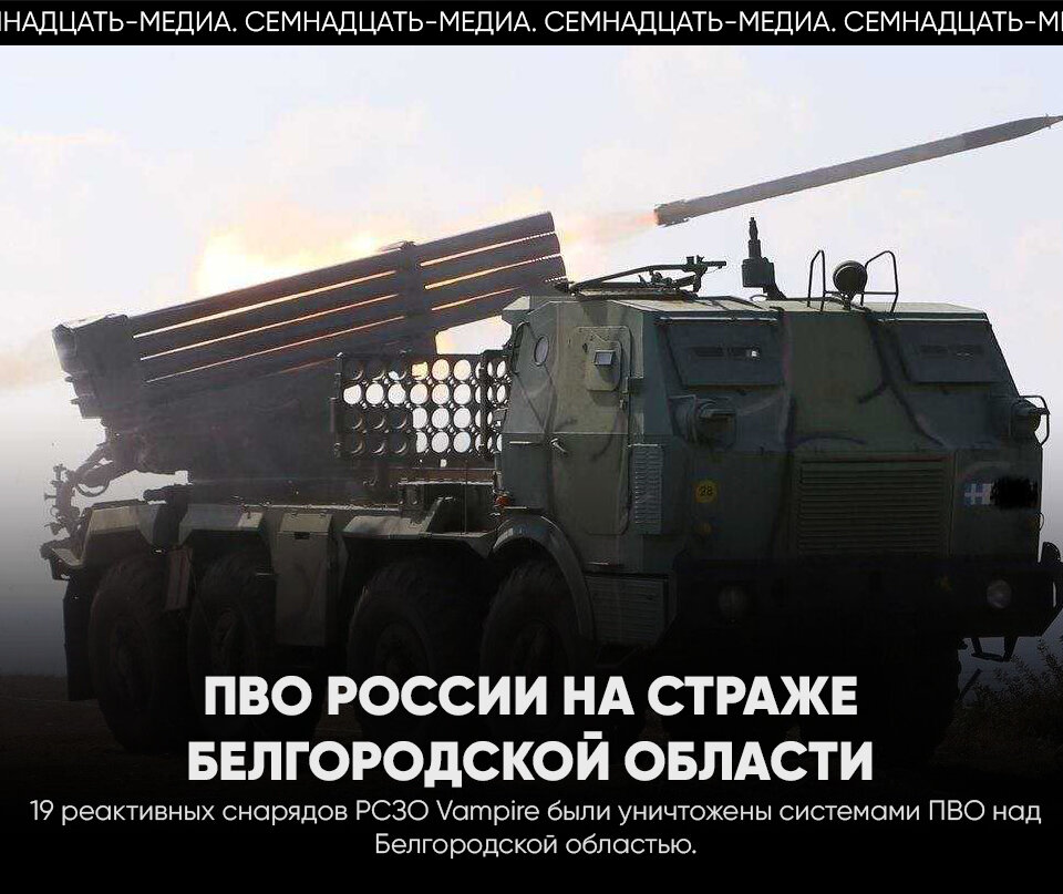 19 реактивных снарядов РСЗО Vampire были уничтожены системами ПВО над Белгородской областью. - Минобороны РФ