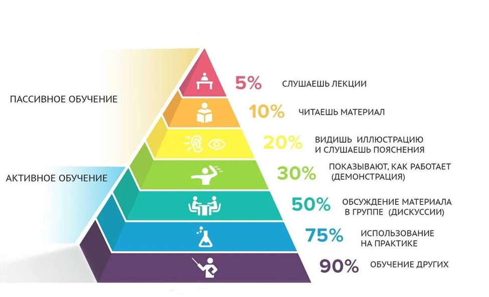 Друзья мои. Мне нравится эта простая и доступная схема. На ней цветным по белому описаны преимущества активных форм обучения. При обучении расстановкам в Центре «Ольвия» всё ровно так и обстоит. Лекции и теоретические сообщения нужны, прежде всего, как обзоры, помогающие ориентироваться в материале при дальнейшем самостоятельном изучении. Лекции выполняют роль скелета, на котором каждый студент наращивает мышцы своих самостоятельных открытий и опыта. Объем лекций – не более 1/4 или 1/3 отведенного времени занятий, ровно столько, чтобы студент потом смог повторить описанный в лекции приём работы на практике. В центре «Ольвия» при обучении расстановкам и в рамках других обучающих программ активно используется самостоятельное изучение литературы по теме занятия. 1500 статей на тему расстановок размещено: