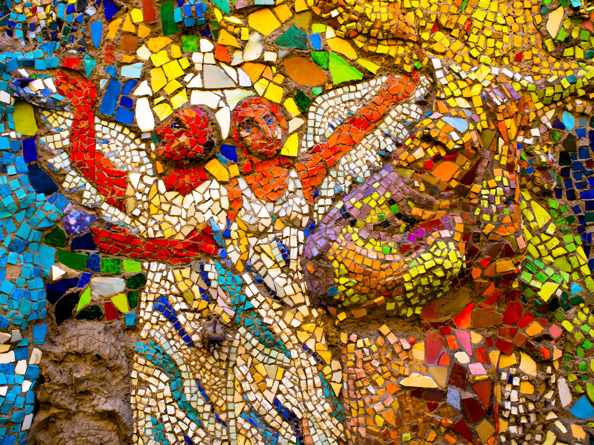Среди обычных дворов Фонтанки можно встретить один яркий, необычный дворик, превращенный в сказку стараниями художника Владимира Лубенко и его юных учеников из подростково-молодежной школы под названием "Малая академия искусств. Для изготовления использовали кусочки смальты, керамической плитки,фарфора и мрамора, есть некое сходство с Гауди, правда? Помогали в облагораживании дворика даже соседи - приносили свою посуду (фарфоровые чашки, тарелки). Говорят, и сейчас можно принять участие и своими руками дополнить, например, поребрик)). Главный объект дворика – мозаичная стена «Санкт-Петербург – Олимп культуры» (так назвал сам Владимир Лубенко), которая посвящена Санкт-Петербургу и его великой истории. В одном месте мозаичной стены есть фрагмент без мозаичного покрытия - это напоминание о подвиге блокадного Ленинграда, здесь изображена семья, поддерживающая друг друга в то трудное, ужасное время. А парадную (разве можно такое назвать подъездом) поддерживают атланты и кариатиды. А вот