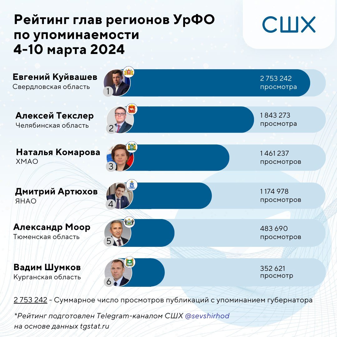 Минус одну позицию потерял губернатор Челябинской области Алексей Текслер. Про него хоть и вышло 883 публикации, однако они набрали 1 843 273 просмотра. Инфоповод снова сомнителен: появилась информация, что Текслер заключил деловое соглашение с лидером «Справедливой России» Сергеем Мироновым. Последний обязуется не выставлять против Текслера никого на выборах губернатора Челябинской области, взамен этого первый отправит в Совет Федерации представителя от эсеров.