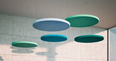 Если нет возможности установить стандартный, привычного вида подвесной потолок, то решение проблемы с шумом и улучшением слышимости, разборчивости речи — использовать отдельно висящие акустические панели.