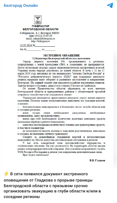 В одном из телеграм-каналов опубликовали документ экстренного оповещения от губернатора Белгородской области Вячеслава Гладкова. В тексте сообщается о прорыве границ региона украинской стороной и необходимости эвакуации.