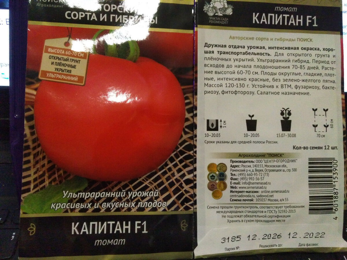"F1" в маркировке означает – гибрид (семена получены в ходе скрещивания 2 или нескольких сортов, обладают лучшими качествами этих сортов, имеют хорошую всхожесть и хороший урожай, устойчивы к болезням. Однако сбор семян из гибридных томатов не рекомендуется, так как есть вероятность получить из этих семян растения, не похожие на родительские. Отсутствие маркировки "F1" означает, что это сорт, можно собрать семена и наследующий год снова вырастить этот же сорт. Мой выбор на 2024 год (сначала те 7, которые выращивала в прошлом году): 1. "Капитан F1": гибрид, ультраранний, от всходов до начала плодоношения 70-85 дней, высота 60-70 см, масса 120-130 г. Правильн