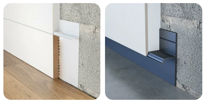 И теневой, и скрытый плинтус монтируются к основанию стен на этапе чернового ремонта. Если у вас уже готова чистовая отделка, то с установкой возникнут дополнительные проблемы. Нужно будет штробить стену до основания, выравнивать ее по низу, устанавливать скрытый плинтус, выравнивать стену над плинтусом и корректировать отделку.