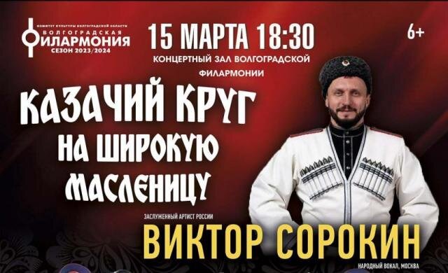 Центральный концертный зал Волгограда приглашает на фестиваль-концерт «Казачий круг на широкую Масленицу». Организатор и вдохновитель – известный волгоградский ансамбль «Лазоревый цветок» во главе с заслуженным артистом России Геннадием Сипотенковым. Перед концертом 15 марта в 16.30 в фойе ЦКЗ откроется выставка казачьих народных промыслов, на которой будут представлены подлинные костюмы и предметы бытовой утвари казаков. Кроме того, посетителей фестиваля ждёт песенно-танцевальная программа. Её представят различные казачьи коллективы области. В 18:30 на главной сцене выступит заслуженный артист России Виктор Сорокин, известнейший и популярнейший исполнитель казачьих и всяких других хороших песен. В программе также участвует государственный Ансамбль Российского Казачества (г. Волгоград, художественный руководитель ансамбля Евгений Воронин). Все вопросы по телефонам: 38-21-96, 38-66-00. 6+
