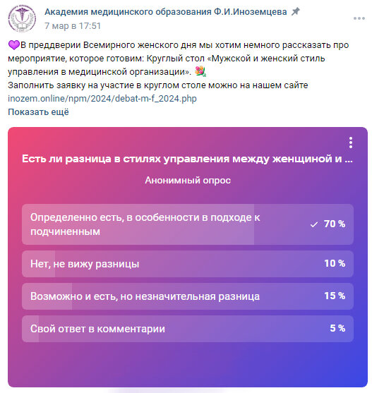 Мы готовим мероприятие Круглый стол «Мужской и Женский стиль управления в медицинской организации», и пусть время гендерных праздников прошло, но 8 марта было совсем недавно. В преддверии этого праздника мы проводили опрос в нашей группе ВК: отличается ли женский стиль управления от мужского, пока результаты следующие: Опрос еще идет, заходите в нашу группу ВК и голосуйте. А если обратиться к статистике, можно увидеть, что в последнее время в России наблюдается увеличение доли женщин-руководителей. Однако, вопрос о том, отличается ли женский стиль управления от мужского, является сложным и многогранным. Некоторые исследования показывают, что женщины-руководители могут проявлять большую эмпатию и заботу о своих подчиненных, что может способствовать созданию более благоприятной рабочей атмосферы. Они также могут быть более склонны к коллективному принятию решений и учитывать мнение всех членов команды. Однако, стоит отметить, что стиль управления зависит не только от гендерной принадлежн