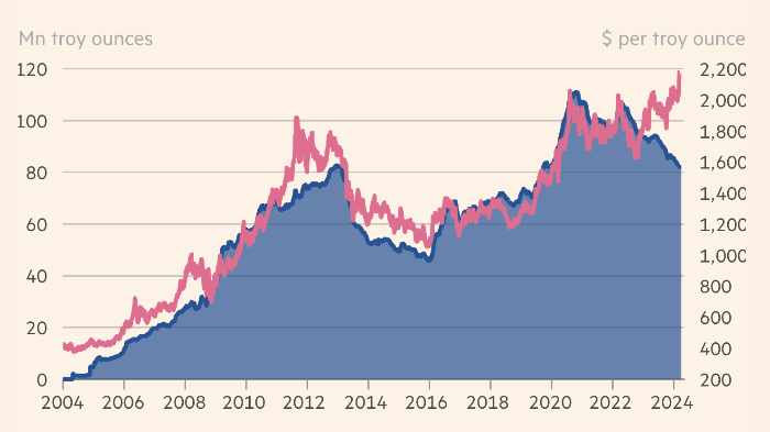 Корреляция спотовых цен и запасов ETF. Источник: The Financial Times