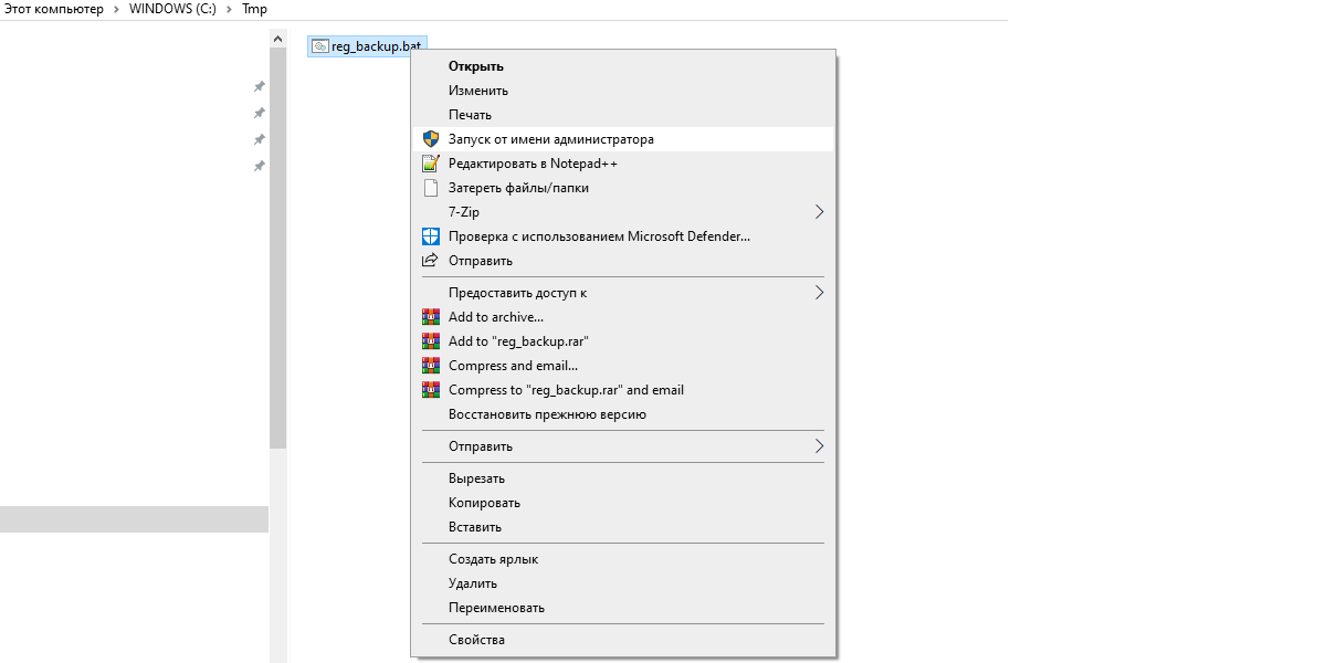 .. Всем привет. Однажды я столкнулся с ситуацией, когда в результате обновлений порушился реестр и при загрузке рабочего стола Windows 10 не работала ни клавиатура ни мышь, в том числе и по удалёнке. Тут свинью подложил "уставший" жёсткий диск, наложилось одно на другое и произошёл сбой. Я уже не помню как я определил что проблема была в реестре, вроде я открывал его утилитами и были сообщения что реестр порушен. Эта публикация посвящена бэкапу реестра. Здесь всё будет применимо как к Windows 7 так и к Windows 10, проверял. О том как восстанавливать реестр будет отдельная публикация. Во первых. Для этого мне нужно вначале установить Windows 7 или 10 на виртуальную машину (чтобы не подвергать риску рабочую машину, т.е. компьютер). Во вторых, смешивать всё в кучу такое себе занятие т.к. так информация хуже воспринимается. БЭКАП СКРИПТОМ .. Чтобы не выполнять команды по архивации в командной строке я сделала bat-скрипт, который сделает всё сам. Скачать его можно с яндекс диска по ссылке "