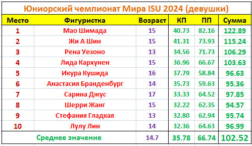 Как и ранее в Превью юношей для того, чтобы подчеркнуть высокий уровень наших юниорских стартов у девушек приведу несколько сравнительных статистических табличек двух разных Миров. Ранее я уже сравнивал технический уровень взрослых российских стартов и турниров Мира ISU. Давайте теперь сравним юниорок по итогам ЮЧМ ISU 2024 и Первенства России 2024, взяв за основу технику 10 лучших фигуристок.