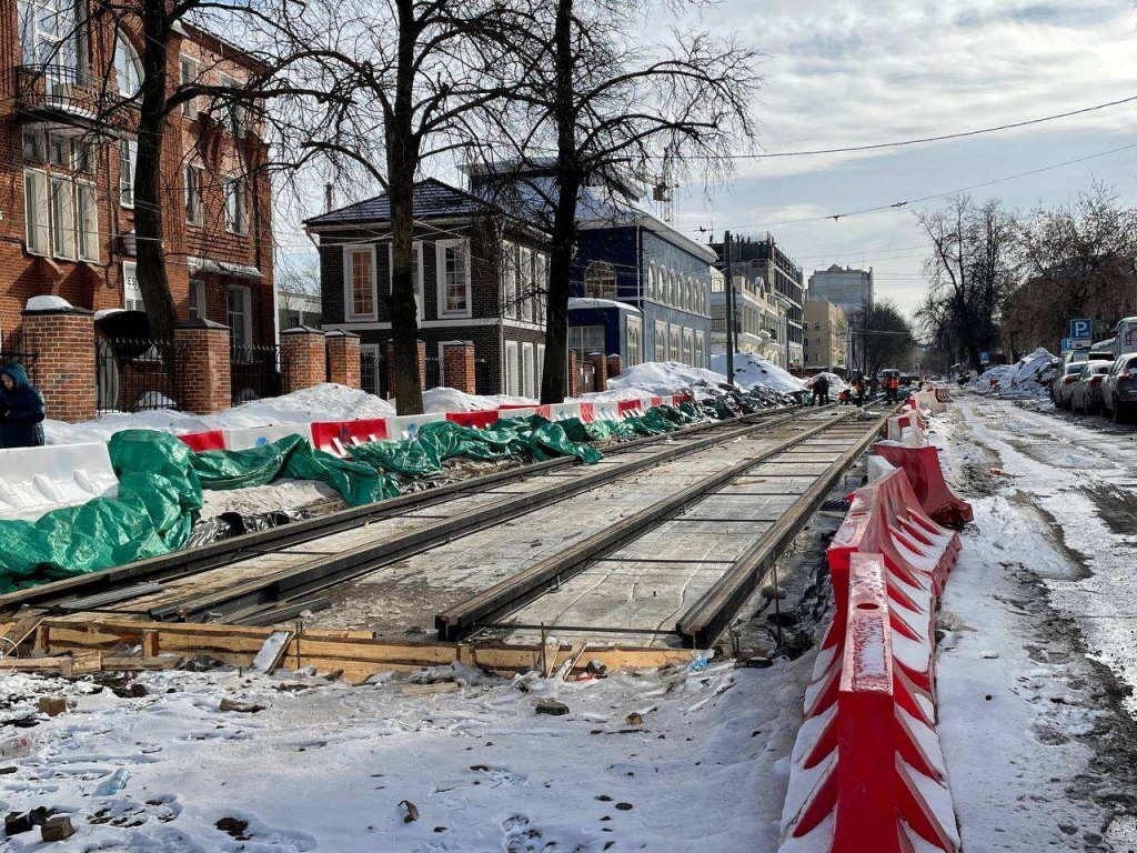 Реконструкцию трамвайных путей от площади Лядова до улицы Нартова оценили в Нижнем Новгороде. Масштабная модернизация трамвайной инфраструктуры в верхней части города началась в марте прошлого года. Завершить обновление рельсов планировалось в начале 2024-го. Наши коллеги из ДОМОСТРОЙНН.РУ побывали в зоне производства работ и посмотрели, в какой стадии они находится. На разных участках трудятся группы рабочих по 8–10 человек, выяснил корреспондент издания. В районе остановки «Площадь Лядова», которая находится на пересечении улиц Белинского и Кулибина, видны обновленные рельсы на бетонной подложке, а чуть дальше по улице Кулибина складированы стройматериалы. Пути между трамвайными остановками «Улица Кулибина» и «Улица Студенческая» накрыты тентом, из-за чего невозможно оценить, в каком состоянии рельсы. Работы на большей части путей от улицы Пушкина до улицы Бекетова не завершены: прямо у дороги на Пушкина новые рельсы обрываются. Дальше начинается заснеженная тропа, по которой ходят г