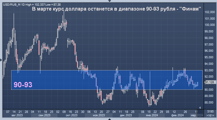 Следующая волна укрепления рубля ожидается к концу марта - "Финам" График доллар/рубля интервалами в 1 день В марте валютный рынок будет влиять внутриполитический фактор: накануне президентских выборов курс рубля обычно демонстрирует стабильность, либо укрепление. "Власти приложат максимум усилий для того, чтобы в этом году на валютном рынке все было спокойно. С позиции властей было бы логично не отпускать рубль в свободное плавание сразу после выборов. А ослаблять его потом постепенно, балансируя между высокой инфляцией и потребностями бюджета", - пишет представитель компании "Финам" Александр Потавин. Следующую волну роста рубля следует ждать ближе к концу марта, когда компании-экспортеры будут платить повышенные объемы налогов в бюджет. "Поэтому на март месяц наш прогноз по курсу доллара - торговля в диапазоне 90-93 руб. По евро мы ждем торговлю в марте в районе 98-101 руб. А курс китайского юаня скорее всего не выйдет за границы 12,5-12,8 руб." MarketSnapshot - ProFinance.Ru в Tele