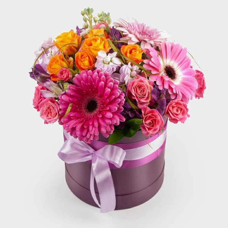 😏 Хотите сделать комплимент и порадовать понравившуюся вам девушку? Цветы – прекрасный и желанный подарок, который может поднять настроение и вызвать улыбку на лице. Особенно если это композиция в шляпной коробке — необычный и стильный вариант оформления букета. Такая композиция порадует получателя своим изысканным дизайном и необычной цветовой палитрой. 💐 Цветы подобраны таким образом, чтобы создать гармоничный ансамбль, который будет радовать глаз и наполнять пространство атмосферой нежности и романтики. Нежная альстромерия, яркие элегантные розы, изысканная гербера и зелень рускуса безупречно гармонируют и составляют яркую палитру, которая никого не оставит равнодушным. Милый и чарующий букет станет замечательным подарком на первое свидание, День всех влюбленных или просто как символ восхищения. Он поможет выразить свои чувства и передать самые искренние эмоции, которые только могут наполнять влюбленное сердце.❤️ 🎁 Композиция в шляпной коробке станет отличным выбором для тех, кто