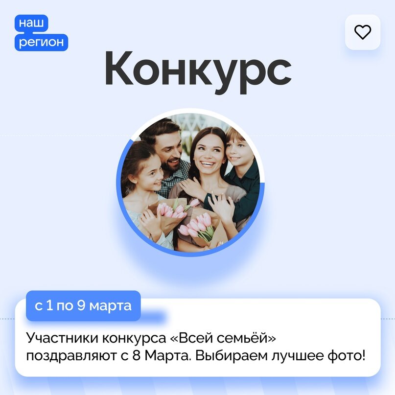 Цветы и поделки, шарики и сладкие комплименты — такие подарки приготовили костромские семьи в честь Международного женского дня. И запечатлели моменты подготовки и праздничного поздравления на фото с хэштегами #всейсемьей и #всейсемьей44. Напоминаем, что теперь на победу влияет и мнение подписчиков. В еженедельный финал попадают фото, набравшие наибольшее количество лайков в постах нашей группы. Лучших из них выбирают эксперты. Итоги регионального отбора подведём 9 марта. Для участия в федеральном этапе пройдите регистрацию: https://vk.cc/cu1zjD У вас ещё есть возможность присоединиться к конкурсу, получить призы для организации семейного досуга и поучаствовать в розыгрыше семейных путешествий.
