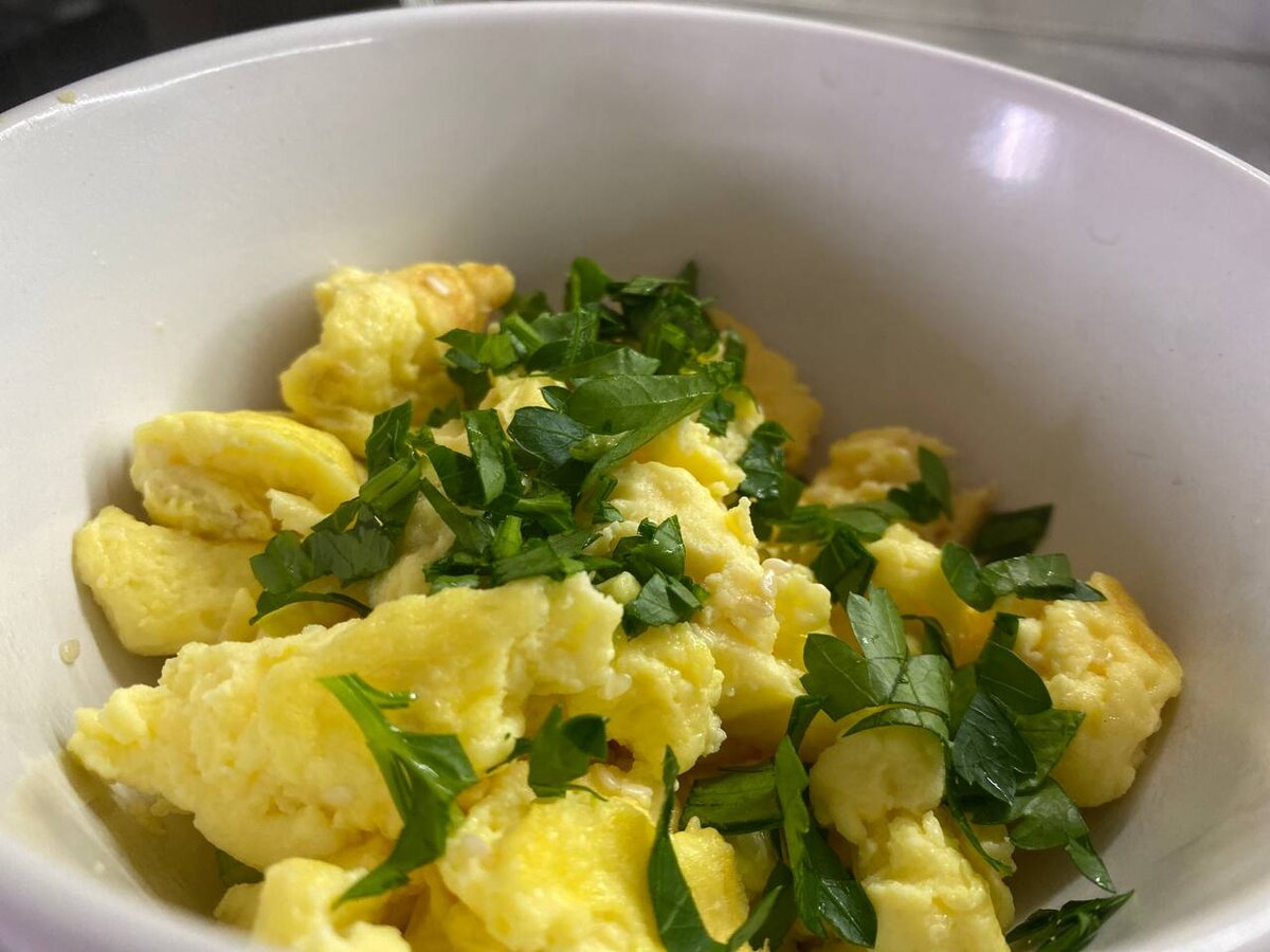 Секрет этого омлета мне поведал знакомый повар. Сначала я думала, что он будет рассказывать классический рецепт, по которому готовит Джулия Чайлд (в одноименном сериале процесс показан в подробностях). Да Вы и сами так готовите, скорее всего: 4 яйца, 2 столовые ложки сливочного масла, 1/4 чайной ложки соли, и немного свежемолотого черного перца. Взбил и поджарил. Но этот омлет напоминает скорее скрэмбл. Отличительной особенностью можно назвать наличие сметаны в рецепте. Итак, вот, что нам потребуется на 2 персоны: Этап 1. Разбиваем в миску 4 яйца, добавляем сметану и соль. Взбиваем венчиком или миксером не менее минуты до получения гладкой глянцевой массы. Этап 2. Растапливаем масло на сковороде. Выливаем яичную массу. Периодически, как только дно припекается, ворошить омлет лопаткой. Этап 3. Измельчаем полученную массу на более мелкие сегменты. Выкладываем в тарелку и украшаем зеленью. Вуаля! Прекрасный, воздушный, нежный омлет, который держит форму. Украшение утреннего стола =)